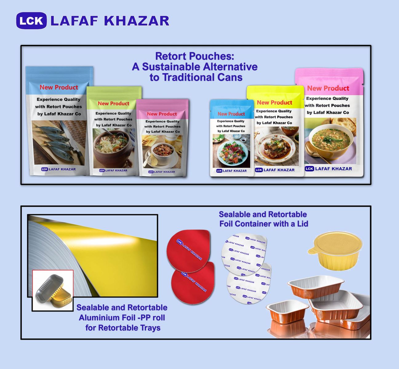 Autoclavable bags and containers are made of several different layers of polymer and aluminum foil, with the outer layer composed of polyester. This outer layer strengthens the packaging and increases its resistance to abrasionThe inner layer adjacent to the food in retort pouches and autoclavable aluminum containers is made of multi-layer, impermeable polypropylene films that are resistant to autoclaving heat. These films also exhibit excellent chemical resistance to all types of acids, bases, and fats, effectively preserving the quality, taste, freshness, and original texture of the food over many years of shelf life. Due to their superior properties and practical advantages over traditional metal cans, these bags and containers can market a wide range of seafood, meat, vegetables, and other food items in various capacities, featuring exclusive and attractive designs. Autoclavable bags allow printing in up to eight colors, enhancing the product's presentation and appeal.